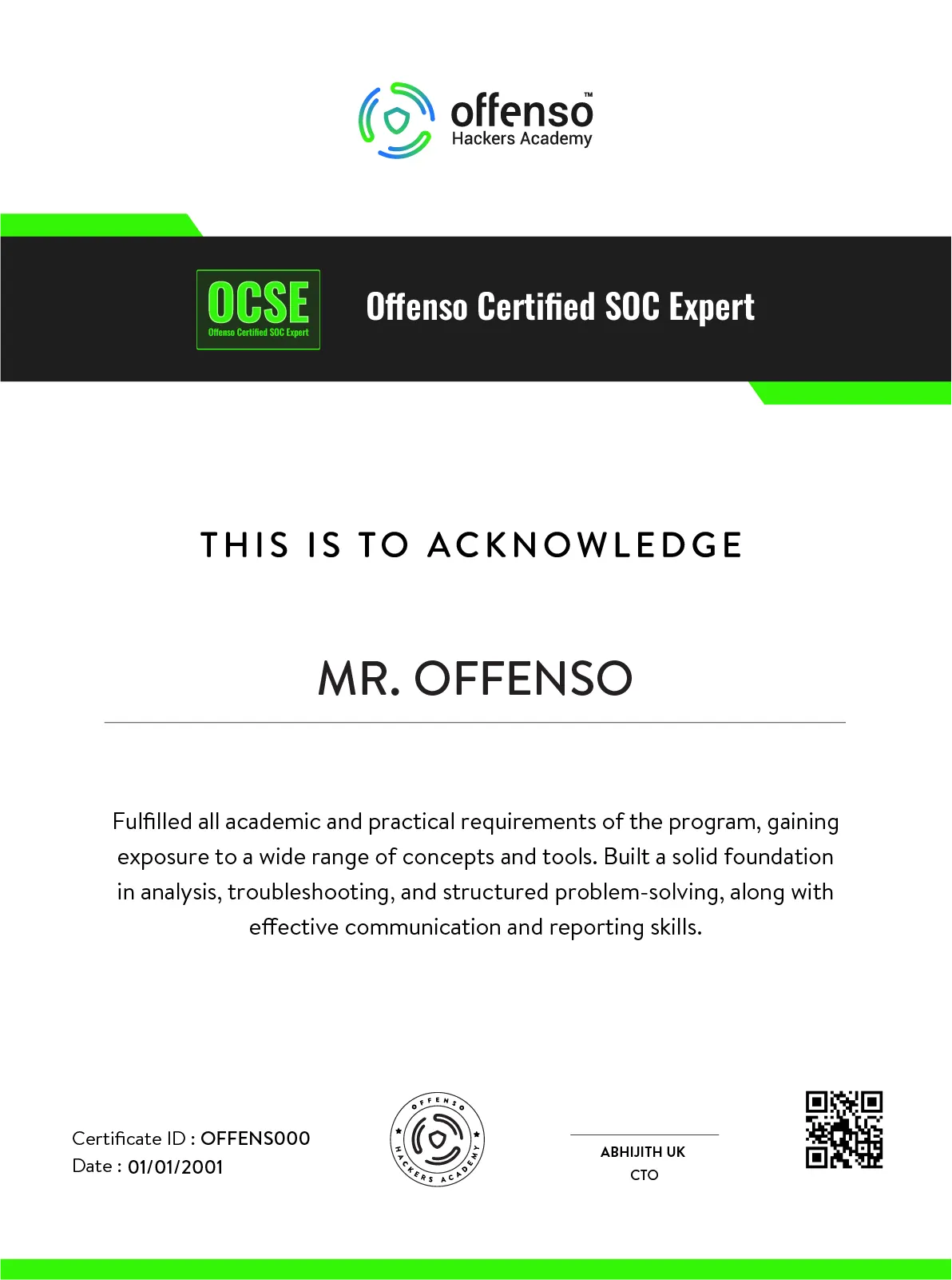 The Offenso Certified SOC analyst Course is a hands-on and immersive training experience that covers essential topics to build expertise in the realm of Security Operations. Our expert instructors will guide you through real-world scenarios, practical exercises, and interactive simulations, ensuring you develop the necessary proficiency to protect organizations from sophisticated cyber adversaries.